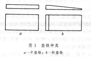 主要有平墊鐵和斜墊鐵(圖1)兩種。平墊鐵用于承受主要負荷和有較強連續(xù)振動的設備。斜墊鐵有單塊斜墊鐵和成對斜墊鐵兩種,單塊斜墊鐵大多不承受主要負荷,其下面應有平墊鐵;成對斜墊鐵用于承受主要負荷,在配合座漿法施工中普遍使用。平墊鐵一般為矩形,但因設備安裝部位或設備構造的需要,有時也采用開口墊鐵或L形墊鐵。帶勾頭的成對斜墊鐵一般用于無需地腳螺栓而直接安裝在地坪上的設備。螺栓調整墊鐵,也屬于成對斜墊鐵的范疇,它是通過擰動調整螺栓使兩塊斜鐵相對移動而改變設備高度,可提高安裝工作效率,適用于機床等設備的安裝。