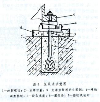 壓漿法 利用螺栓調整墊鐵壓緊灌漿層并對設備安裝進行精調整,使墊鐵與設備底座及灌漿層緊密接觸的施工方法。其作法是:在地腳螺栓的適當位置上焊一根小圓鋼作為螺栓調整墊鐵的支承,當設備用臨時墊鐵安裝初步找平后進行二次灌漿,同時在設備底座與小圓鋼中間裝入調整墊鐵,在灌漿層達到初凝后調整墊鐵的升降塊壓緊設備底座底面和灌漿層,當灌漿層達到規(guī)定強度的75%以后拆除臨時墊鐵,再用螺栓調整墊鐵精調設備的水平度和標高(圖4)。
