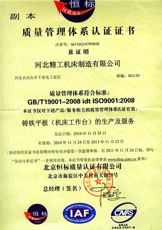 河北精工機床制造有限公司是國內(nèi)大型鑄鐵、銅合金、鋁合金鑄造_,用高科技裝備的研發(fā)中心_了為客戶設計、制造、安裝、調(diào)試一條龍服務。目前工廠年產(chǎn)各種鑄鐵件15000多噸,工廠自1986年成立以來,先后為國內(nèi)外冶金、機械、機床、電力、電子、造船、汽車、航空航天、礦山等行業(yè)的18000多家企業(yè)和公司提供了近百萬套合格的產(chǎn)品和周到的售后服務。主導產(chǎn)品有:鑄鐵平臺、鑄鐵平板系列;方箱、彎板系列;平尺系列;V型鐵、V型架系列;地軌系列;機床鑄件系列;敲擊扳手系列;防爆工具系列;大型鑄鐵件系列;輸送機防雨罩系列等_產(chǎn)品。河北精工機床制造有限公司企業(yè)資質(zhì)文件請點擊《詳細》查看。